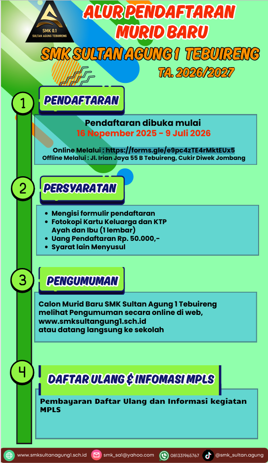 atau bisa secara offline dengan datang ke SMK Sultan Agung 1 Tebuireng, tiap hari kerja (senin sd sabtu) pukul 08.00 - 13.00 wib